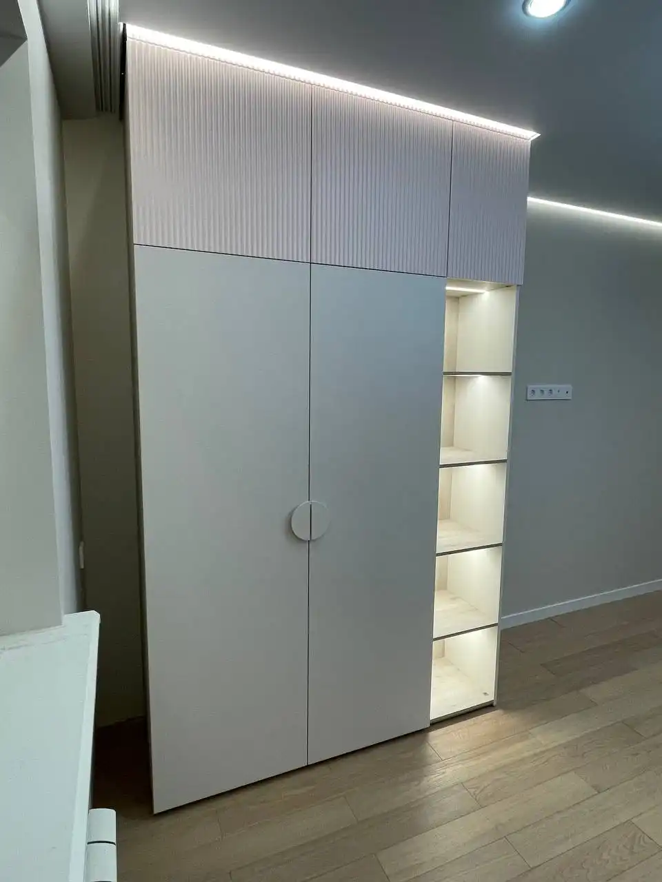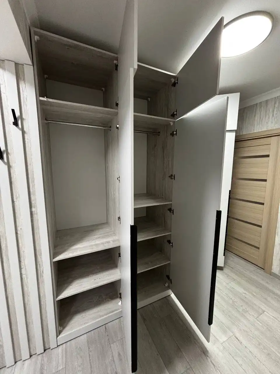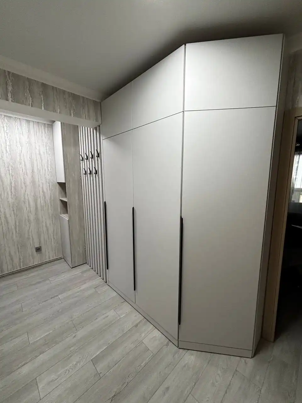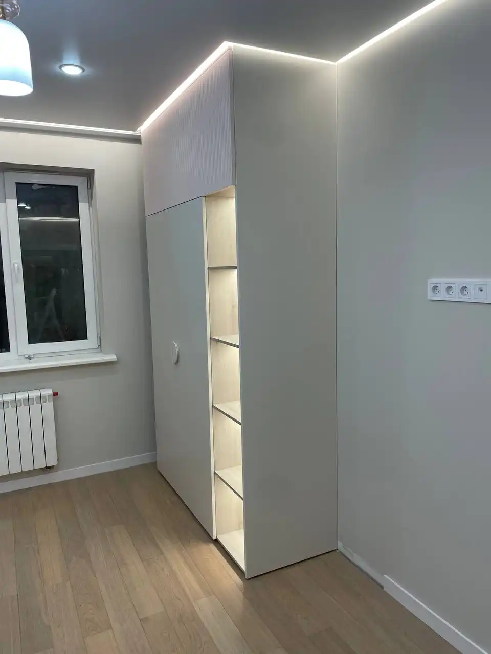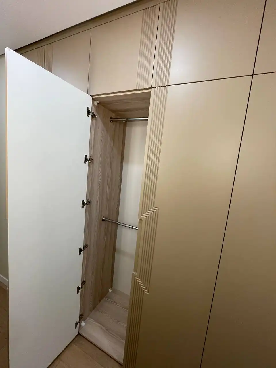 Каждый шкаф мы делаем под конкретное помещение: учитываем реальную высоту от пола до потолка, откосы, трубы и стояки, расположение розеток, открывание дверей соседних комнат. Поэтому шкаф встаёт без зазоров, не «съедает» лишние сантиметры и открывается именно так, как должно быть удобно — а не так, как получилось.