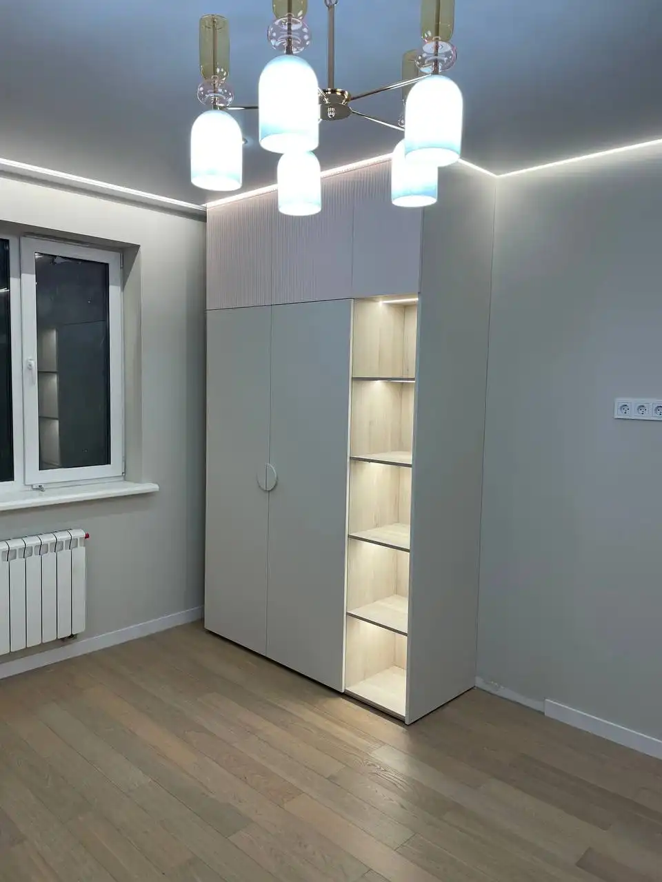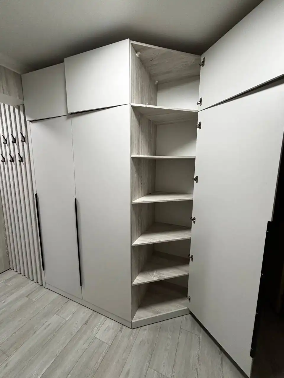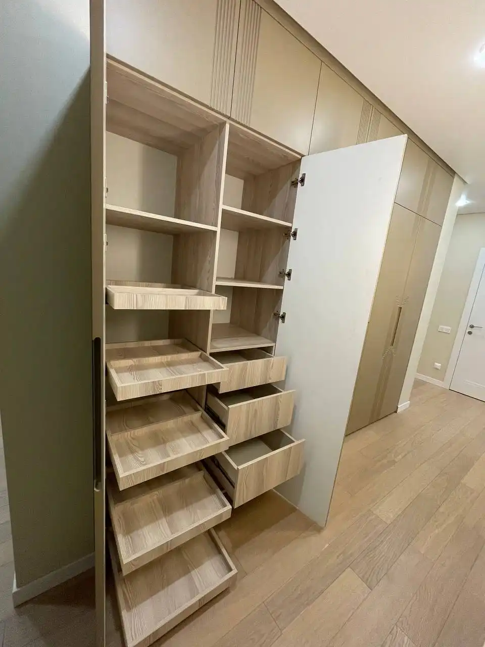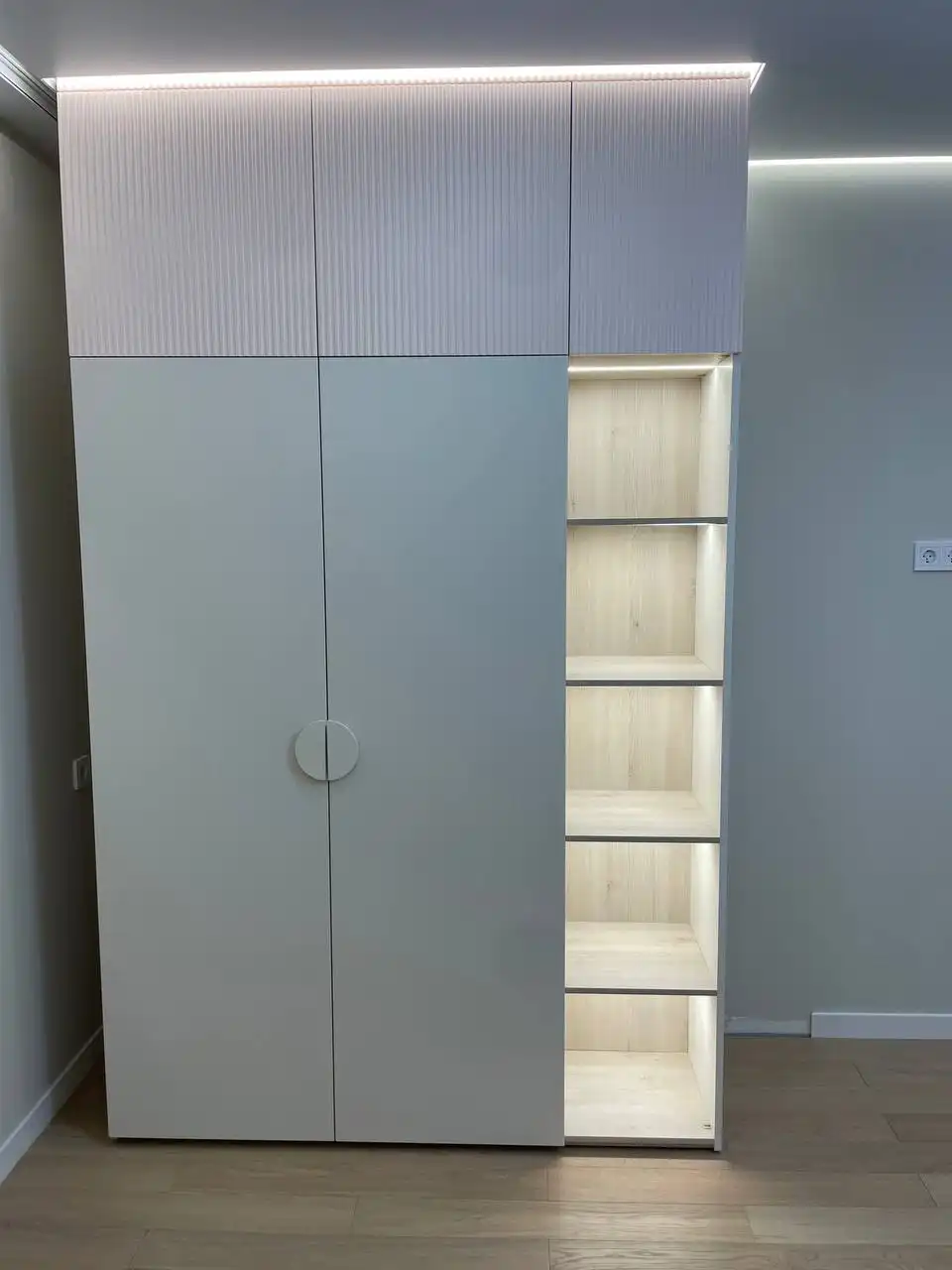 Каждый шкаф мы делаем под конкретное помещение: учитываем реальную высоту от пола до потолка, откосы, трубы и стояки, расположение розеток, открывание дверей соседних комнат. Поэтому шкаф встаёт без зазоров, не «съедает» лишние сантиметры и открывается именно так, как должно быть удобно — а не так, как получилось.