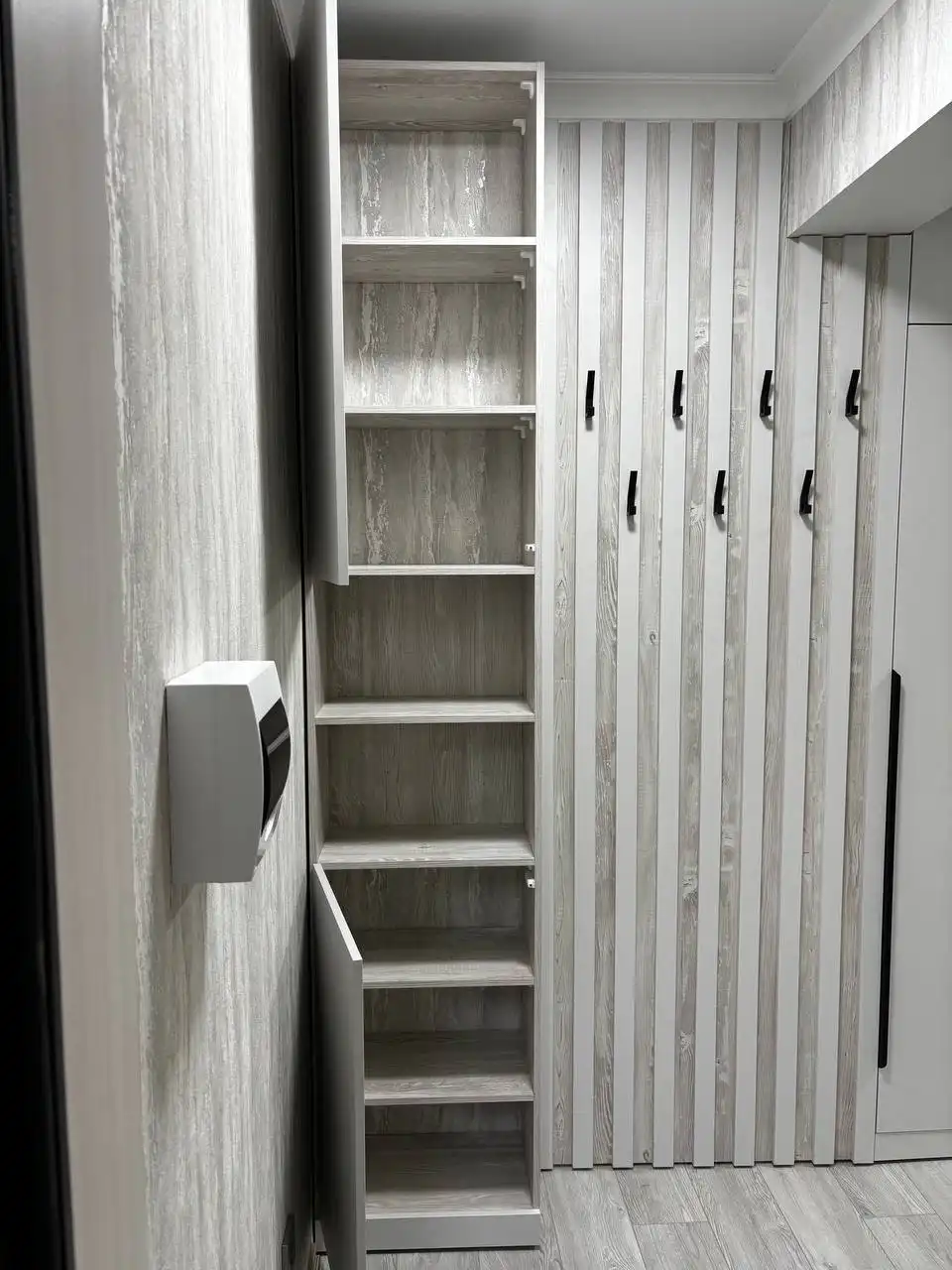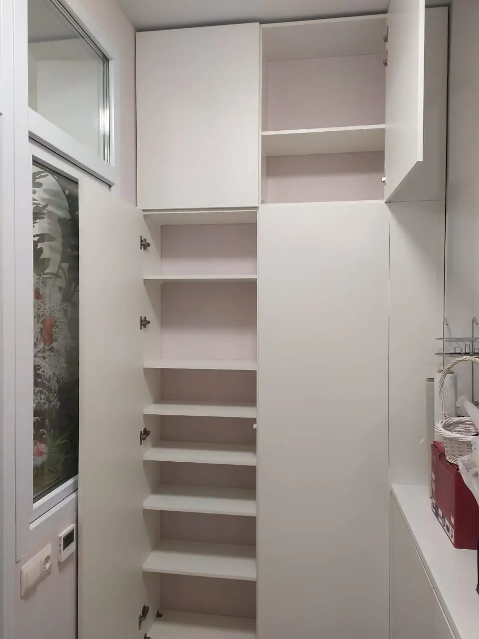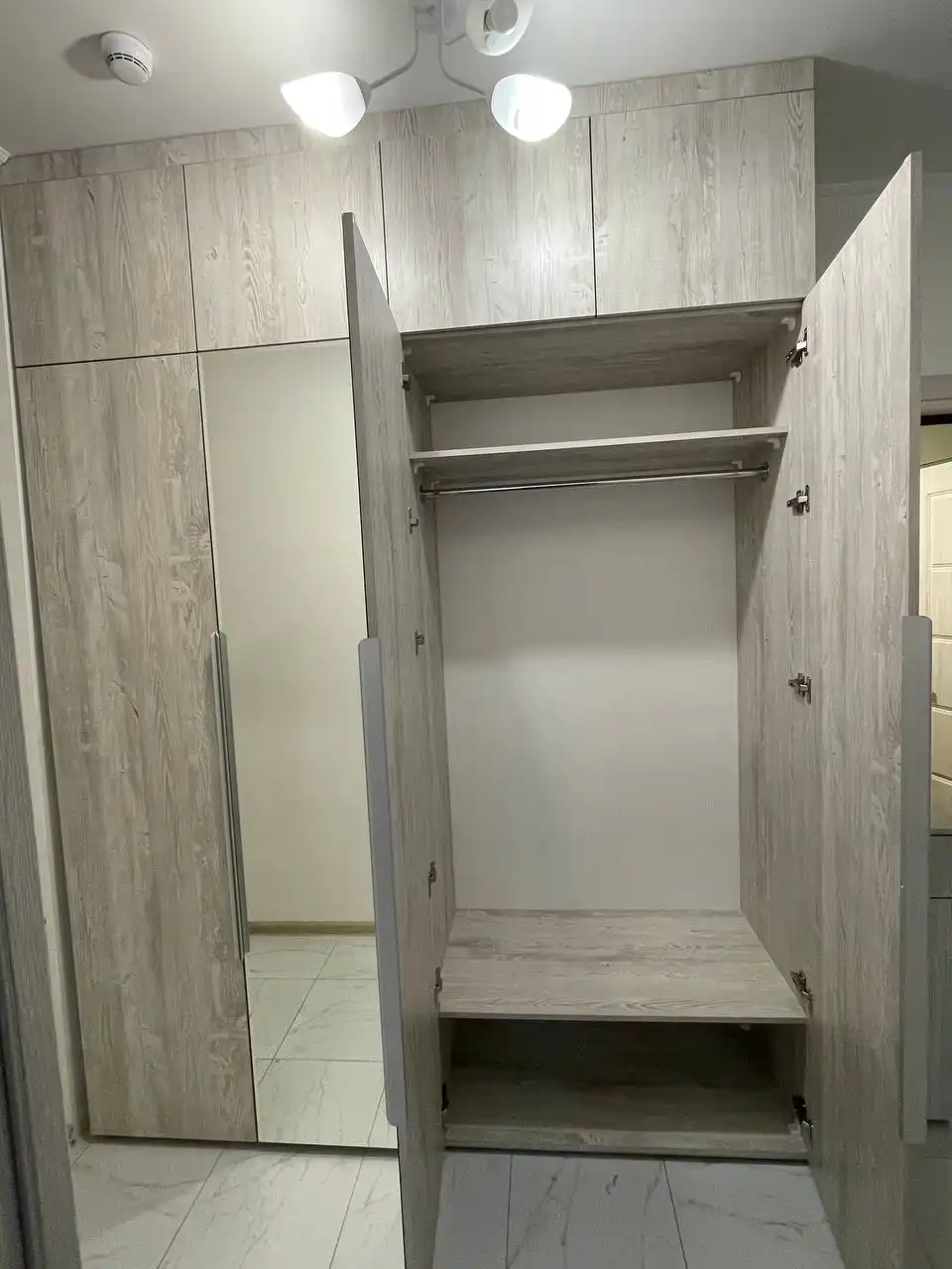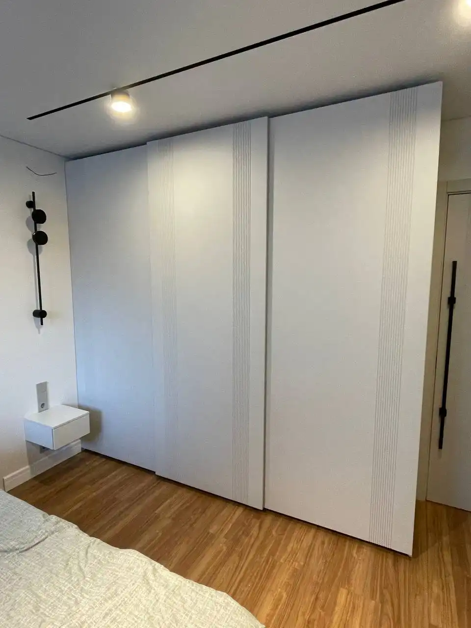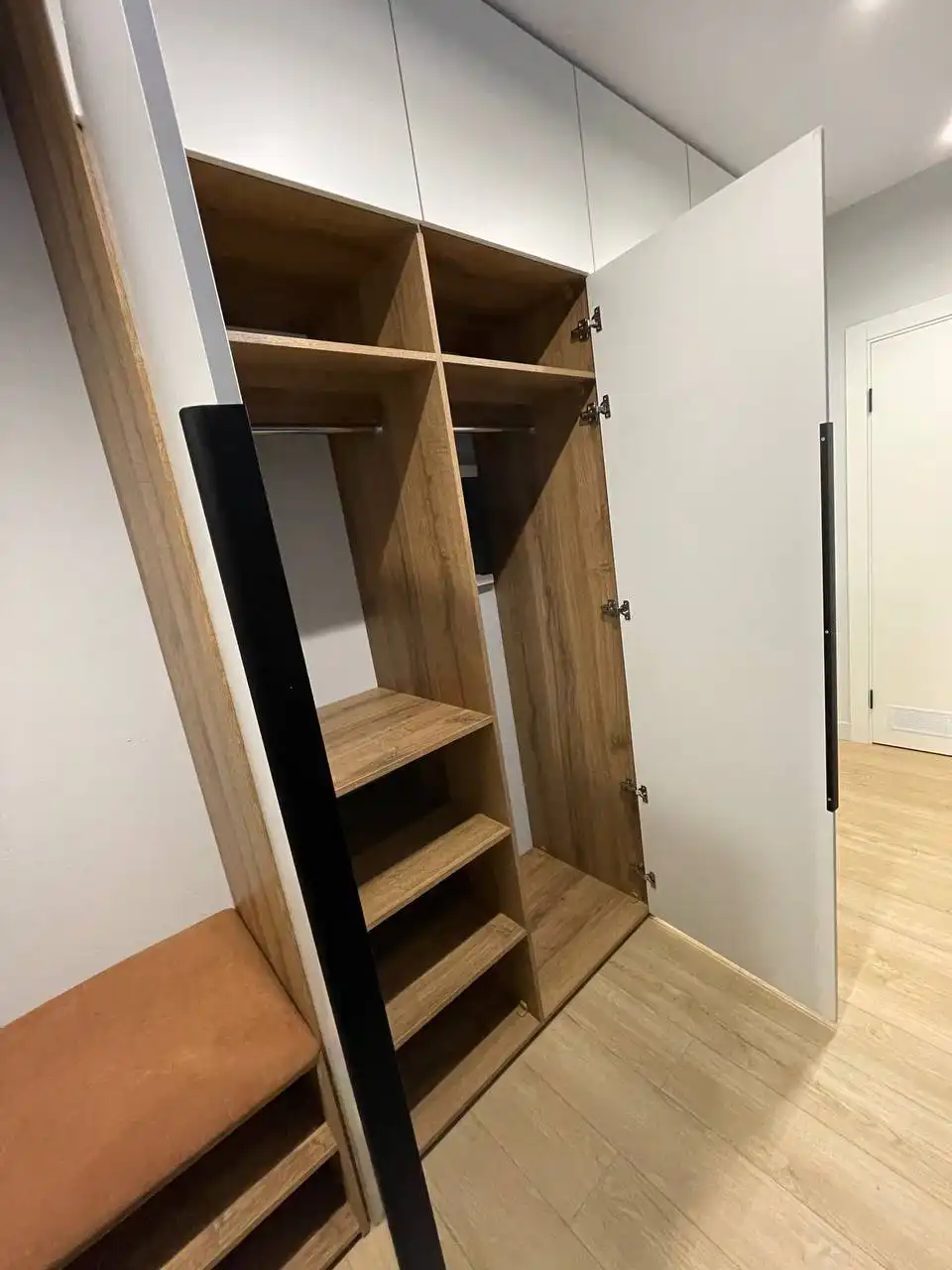 Каждый шкаф мы делаем под конкретное помещение: учитываем реальную высоту от пола до потолка, откосы, трубы и стояки, расположение розеток, открывание дверей соседних комнат. Поэтому шкаф встаёт без зазоров, не «съедает» лишние сантиметры и открывается именно так, как должно быть удобно — а не так, как получилось.