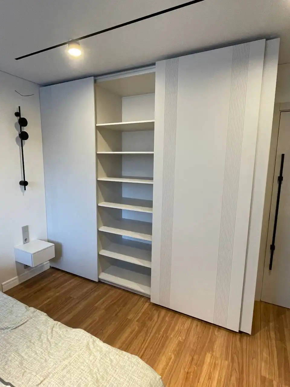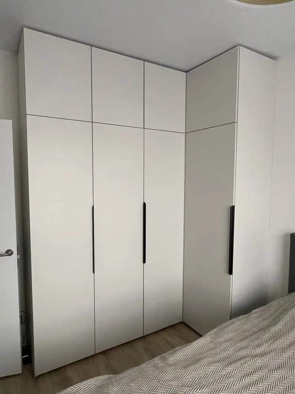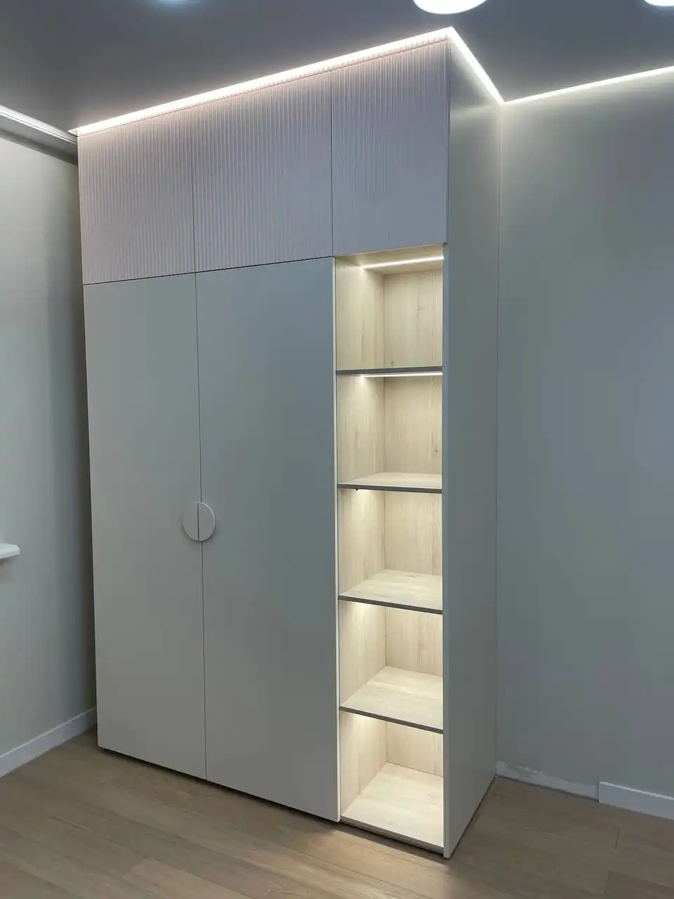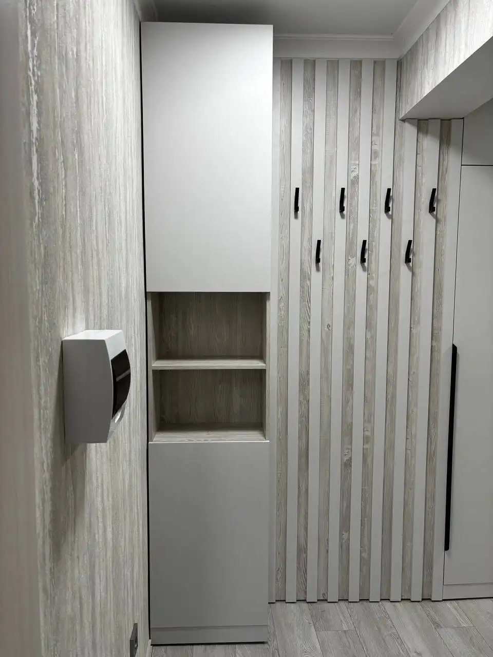 Каждый шкаф мы делаем под конкретное помещение: учитываем реальную высоту от пола до потолка, откосы, трубы и стояки, расположение розеток, открывание дверей соседних комнат. Поэтому шкаф встаёт без зазоров, не «съедает» лишние сантиметры и открывается именно так, как должно быть удобно — а не так, как получилось.