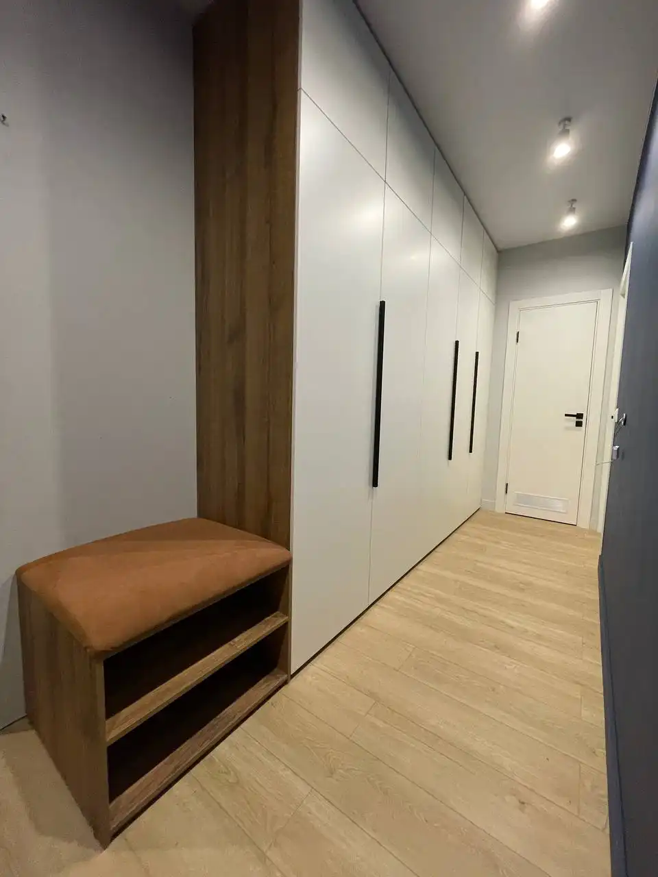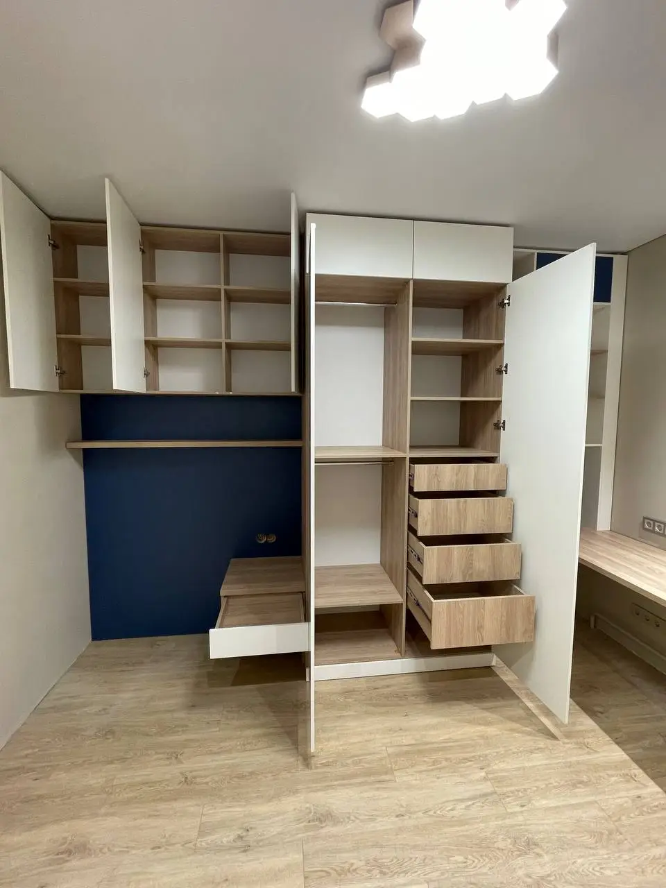 - наполнение: штанги, пантографы для длинных вещей, выдвижные корзины для белья, органайзеры для обуви, подсветка с датчиком — всё по вашему желанию.